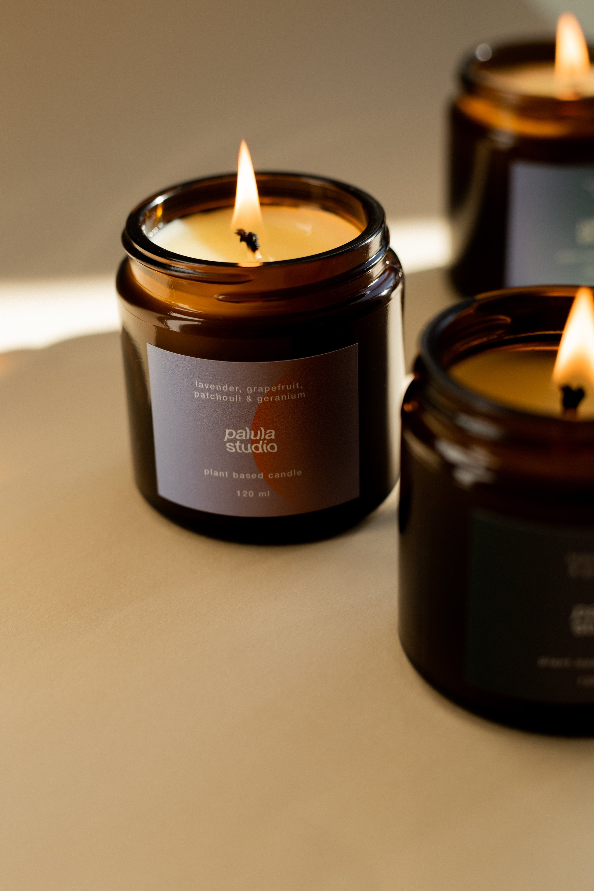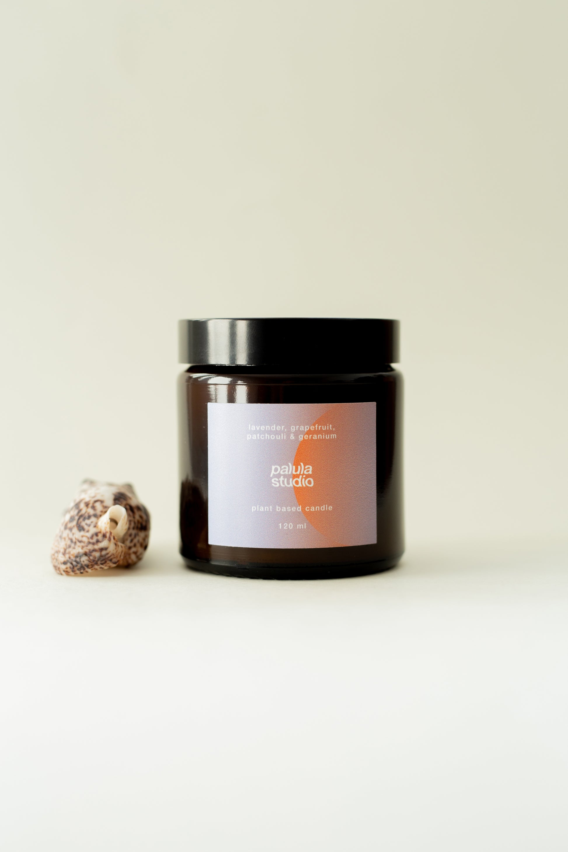 Ręcznie zalewana świeca sojowa wykonana z naturalnych składników o zapachu lawendy, grejpfruta, paczuli i geranium. Ma działania uspokajające, wyciszające i poprawiające nastrój.