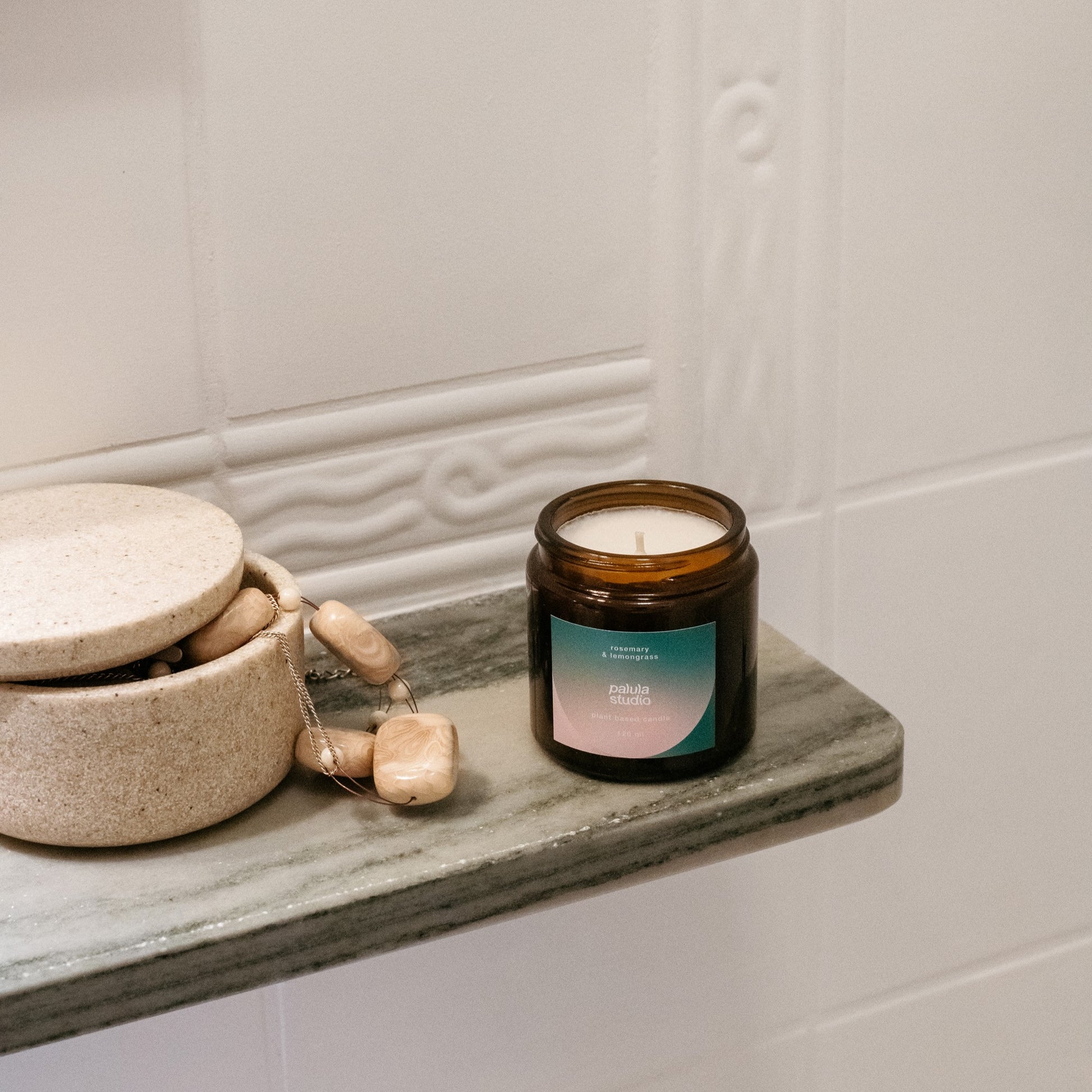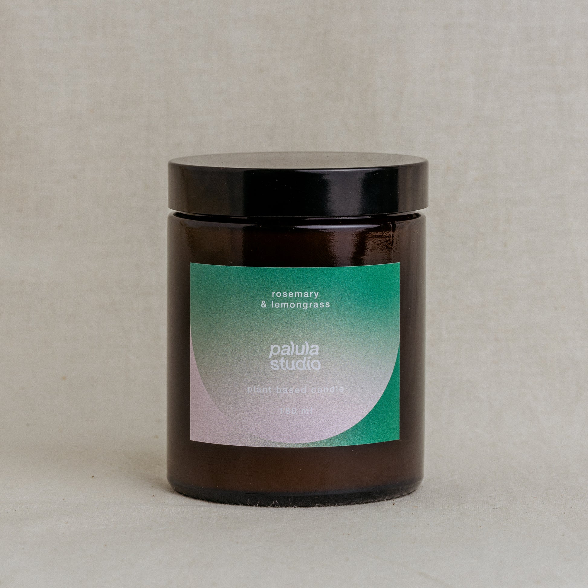 Ręcznie zalewana świeca sojowa wykonana z naturalnych składników o zapachu rozmarynu i trawy cytrynowej. Ma działanie wyciszające i odświeżające.